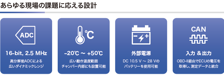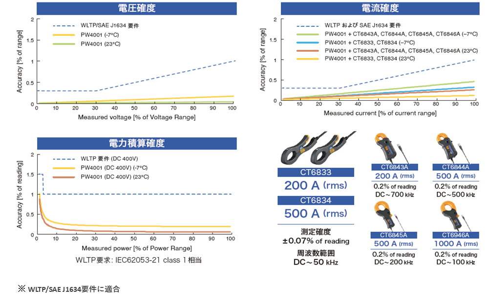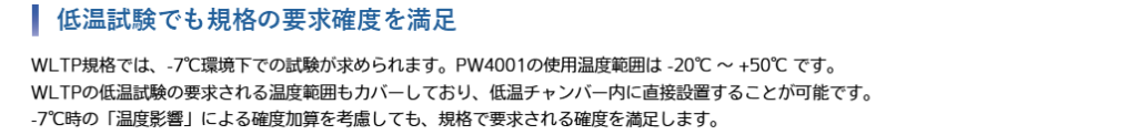 また、車両開発においてはさまざまな温度条件での計測が必要とされますが、PW4001は -20℃ ~ +50℃までの広い温度範囲で安定した計測を提供します。