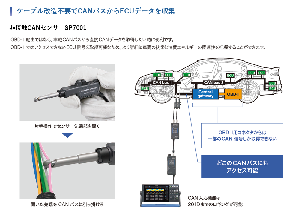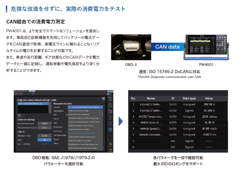 電力と車両情報をひとつの時間軸で捉える計測が求められる中、PW4001は電力と車両情報のデータ統合を1台で実現します。これにより、別々に取得したデータを統合する手間を省くことが可能です。