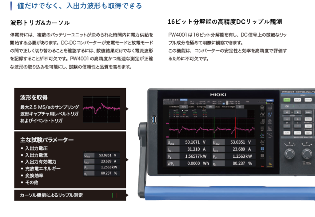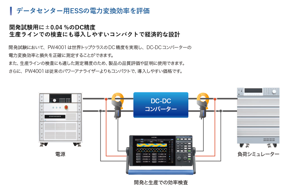最新のEV試験やデータセンター用ESSの電力変換効率測定など、いろいろな計測シーンで活躍します。