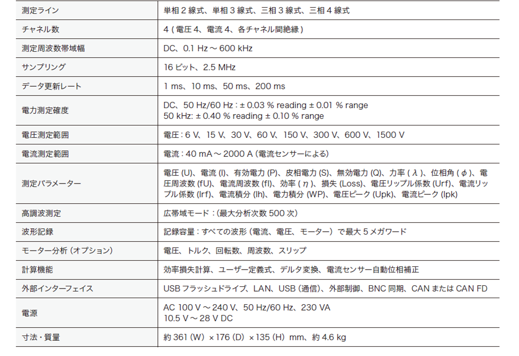 電圧4 ch、電流4 chの電力同時測定が可能です。また、基本確度 ±0.04 %と、ラボ級の高確度をフィールドでも発揮します。